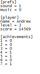 This will open 'savedata.ini' and set score to the value under 'save1' > 'score' in it, then close the .ini again. Should there be no value under 'save1' > 'score', or there no 'savedata.ini' file present, score will be set to 0.