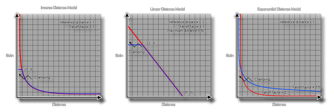 | audio_falloff_linear_distance_clamped | distance = clamp(listener_distance, reference_distance, maximum_distance) gain = (1 – falloff_factor * (distance – reference_distance) / (maximum_distance – reference_distance)) |