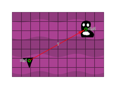 This function returns the length of a vector formed by the specified components [x1,y1] and [x2,y2]. For example, in the image below if we want to get the distance between the player ship position and the enemy position so that we can calculate if the enemy is close enough to shoot at then we would use this function (the exact code is in the example below the image):