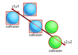 Collision line checks along a line from point x1,y1 to point x2,y2 for a collision with any instance of the object specified by the argument "obj". this check can be either precise or not, but for precise collisions to be enabled, the object or instance that you are checking for must also have precise collisions enabled for their sprite. If not, the default check is based on bounding boxes. The following image illustrates how this works: