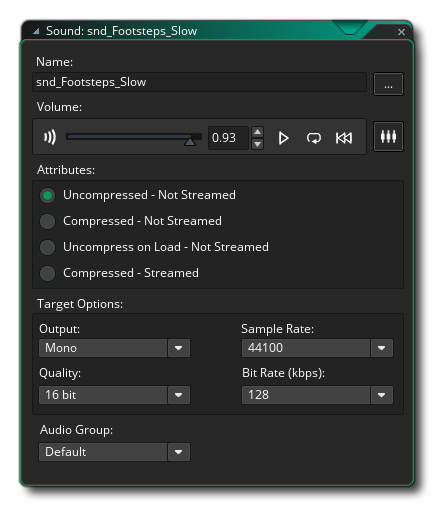 Sounds in GameMaker Studio 2 can be uncompressed or compressed, with compressed sounds having additional options on how to deal with them at run time. Uncompressed sounds are those that have been saved as WAV format files, while compressed sounds can be either MP3 or OGG format. In general you'll want small sound effects to be WAV and larger effects or music to be MP3 or OGG. As with the other different resources, it is recommended that you name your sounds using an appropriate prefix like "snd_" so you can easily identify it later.