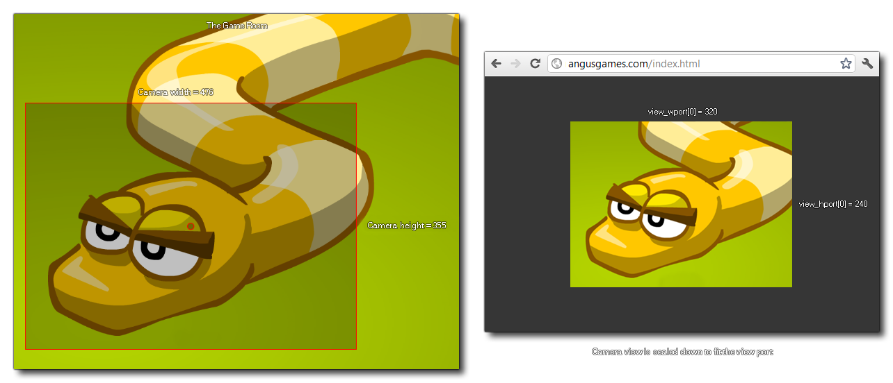 This variable can be used to get or to set the width of the specified view port. The width of the view port (or combined view ports if more than one are active) define the width of the game window or background canvas at the start of the game, so changing this value after the game has started will have no visible effect on the game window size unless called along with the function window_set_size. If you have a larger or smaller port size than that assigned to the camera, then the camera view will be scaled down - or up - to fit, as illustrated by the image below.