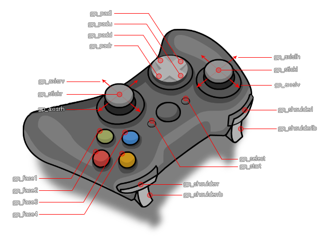 | gp_face4 | Top button 4 (this maps to the "Y" on an Xbox 360 controller and the triangle on a PS controller) |