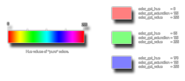 This function will return the hue of the given colour. This is the "pure" colour tone which is part of the hue, saturation and value (luminosity) method for defining a colour. The following image illustrates how this value corresponds to the HSV scale of colour: