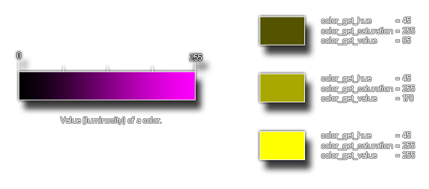 This function will return the value (luminosity) of the given colour. This is the amount of the "light" that is mixed into the final colour and is part of the hue, saturation and value method for defining a colour. The following image illustrates how this value corresponds to the HSV scale of colour: