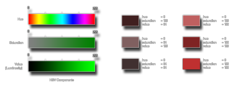 The image on the left is a break-down of the individual components of the function, and then on the right is an illustration of how changing these components affects the end colour. As you can see, even without changing the hue (it stays at 0, red), we can dramatically change the colour with the other two settings, with saturation making the colour tone go from grey (0) to a pure tone (255), and with the value making it go from darker (0) to lighter (255).