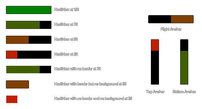 You can set various different things that change the visual aspect of the bar and these are illustrated in the image below (note that the colours used here are c_green for the maximum value and c_red for the minimum value, but you can use the colours that you wish):