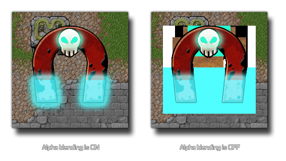 This function can be used to toggle alpha-blending on and off. Basically, if you have this set to false, all images being drawn will be drawn 100% opaque, meaning that any transparent, or semi transparent, areas of a sprite or background will be visible as a solid colour. It is a good idea to have alpha blending off whenever possible (especially when developing for mobile devices) as this greatly increases the draw speed.