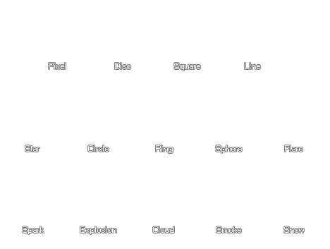 Once you have created your particle type you should give it a shape. This can be one of the 14 built in shapes which are 64x64 pixel sprites with alpha blending, or you can use your own sprites which can be animated, static or use random sub-images. The following functions define the visual base shape of each particle: