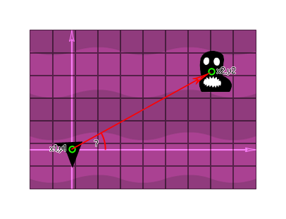 This function returns the direction of a vector formed by the specified components [x1,y1] and [x2,y2] in relation to the fixed x/y coordinates of the room. For example, in the image below if we want to get the direction from the player ship position to the enemy position so that we can fire a missile at the enemy then we would use this function (the exact code is in the example below the image):