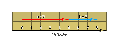 You should realise that it doesn't matter where a vector starts, all that matters is how long it is and what direction it goes in. So vector b starts at 5, is 3 units long and points to the "right", making it identical to a vector starting at 0 and going to 3. Now, you can also add these vectors together, by putting the two vectors a and b end to end to get the vector c which is equal to 8. What about negative numbers? Well, if, in the above image, a vector that points to the "right" corresponds to a positive number, you can see that a vector pointing to the "left" would correspond to a negative number, making a one-dimensional vector nothing more than a signed (+/-) number. This explains the essential concept of a vector: only length and direction ("left" or "right" in this case) count, not position.