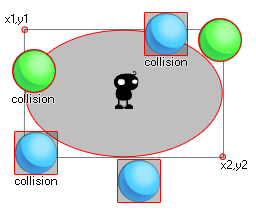 Here, the instance in the middle is using a collision ellipse to check for ball objects. Now, the blue ones do not have a precise bounding box and as you can see, even if the sprite is not actually touching the ellipse, the collision can still happen (even if you set the precise option in the function to true) as the bounding box of that sprite over-laps the elliptical area defined by collision_circle. On the other hand, the green balls will only be considered in collision if the actual sprite over-laps the defined ellipse. Remember, for precise collisions to be considered both the object sprite and the collision function must have precise marked as on. It should also be noted that the return value of the function can be the id of any one of the instances considered to be in collision.