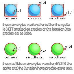 Remember, for precise collisions to be considered both the object sprite and the collision function must have precise marked as on. It should also be noted that the return value of the function can be the id of any one of the instances considered to be in collision, so if three instance overlap at that point, any one of their ids could be the return value of the function.