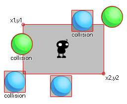 Here, the instance in the middle is using a collision rectangle to check for ball objects. Now, the blue ones do not have a precise bounding box and as you can see, even if the sprite is not actually touching the rectangle, the collision will still happen (even if you set the precise option in the function to true) as the bounding box of that sprite over-laps the collision_rectangle. On the other hand, the green balls will only be considered in collision if the actual sprite over-laps the rectangle. Remember, for precise collisions to be considered both the object sprite and the collision function must have precise marked as on. It should also be noted that the return value of the function can be the id of any one of the instances considered to be in collision.