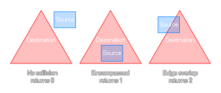 This function will check a rectangular area that you define to see if it is either not in collision, completely within the destination bounds, or if it is simply touching, a defined triangular area. If they are not touching at all the function will return 0, if the source is completely within the destination it will return 1, and if they are simply overlapping then it will return 2. The image below illustrates this: