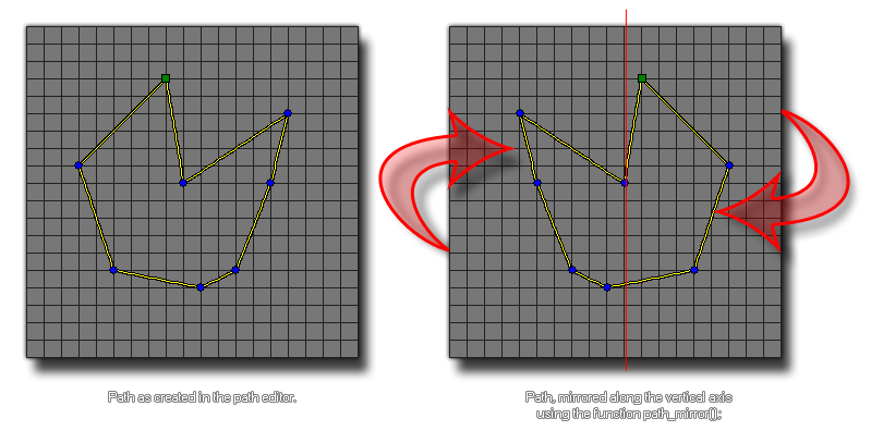 This function takes all the path points and mirrors them along the vertical axis. This function changes the actual path resource, and so will permanently affect how the path is used by all instances in the game from the moment the function is used until the end of the game.